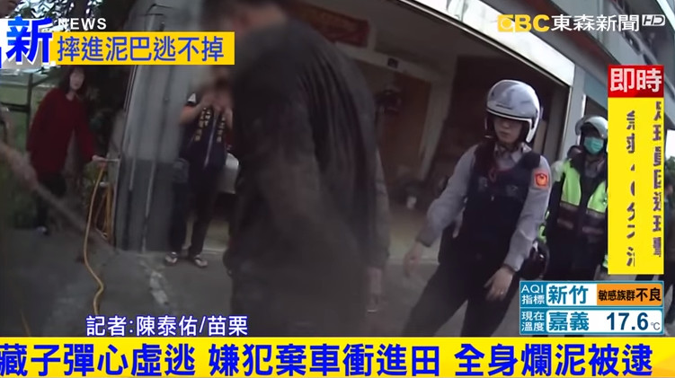 畫面中,林男想躲避警方攔查,騎著機車拼命向前衝刺,完全不顧後方員警的鳴笛聲警告,沿路逆向超車,期間2度自摔,被員警追上後決定棄車逃逸,直接衝進田裡,但是田中滿是泥濘,跑起來相當吃力,最後體力耗盡倒在田埂中被逮。