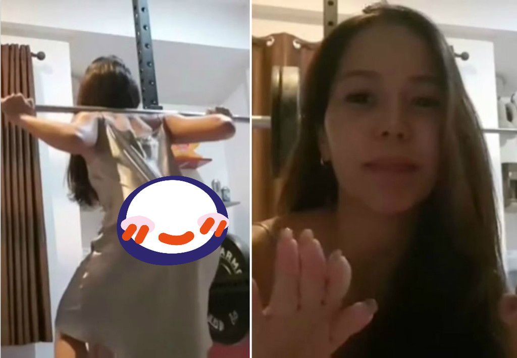 近日網路流傳一段影片,從畫面中可以看見,一名穿著粉紅色緊身睡衣的長髮正妹連臉都還沒有露,就轉身背對鏡頭展現傲人的翹臀,直接用後肩扛起槓鈴深蹲,約略4下後畫面一切,她換成黑色連身裝繼續深蹲,但影片到這裡她都還是未露臉,專注在健身的力與美上面。