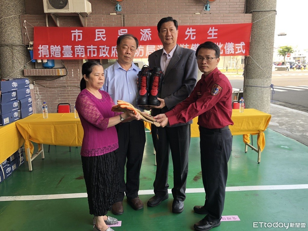 台南市消防局,27日上午10時,在消防局和緯消防分隊舉辦捐贈儀式,由市民吳添祿先生,捐贈消防裝備一批予台南市消防局,並由主任秘書李政昌代表接受並頒贈感謝獎牌,感謝吳添祿先生造福人群的慈善義舉。