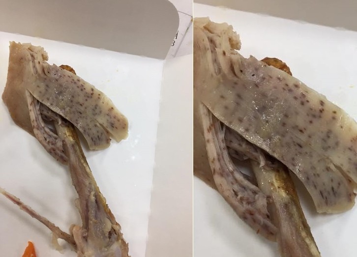 照片中可以看見,雞腿幾乎已經快被原PO吃光,剩下的肉體及表皮上都一點一點的暗紅色斑點,看起來就像患了什麼恐怖疾病一樣,看得原PO直呼:「傻眼!吃一吃,發現炸雞腿是這樣……。」、「根本像火龍果,大家會不會想吐。這絕對不是芋頭!」