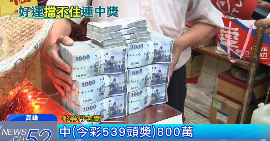 擋不住的好運!高雄一名中年男子夢到一間彩券行會開頭獎,之後天天報到買彩券,必摸店內金元寶,結果買的5張2000元刮刮樂,1張幸運中了100萬元,沒想到,他領獎時順便買的今彩539,竟也中了頭獎,幾天後現身「我中頭獎了!」店家代領扣稅後有636萬8000元,6大疊千鈔由3名員警護鈔送去,羨煞旁人!