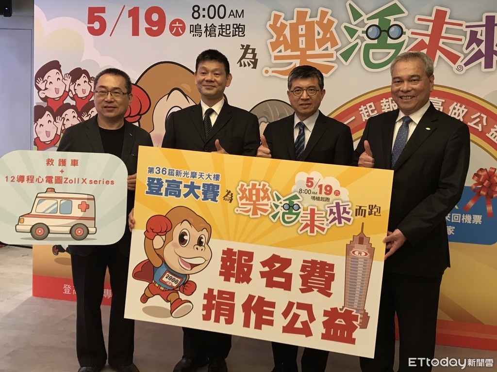 第36屆新光登高大賽「為樂活未來而跑」將在5月19日開跑。今天(28日)主辦單位新光金控集團關係企業舉辦捐贈儀式,將超過800萬元的新款救護車及CPR人體模型等,交給消防署。新光人壽總經理蔡雄繼說比賽最高原則「登高做公益,報名費全數捐出回饋社會。」