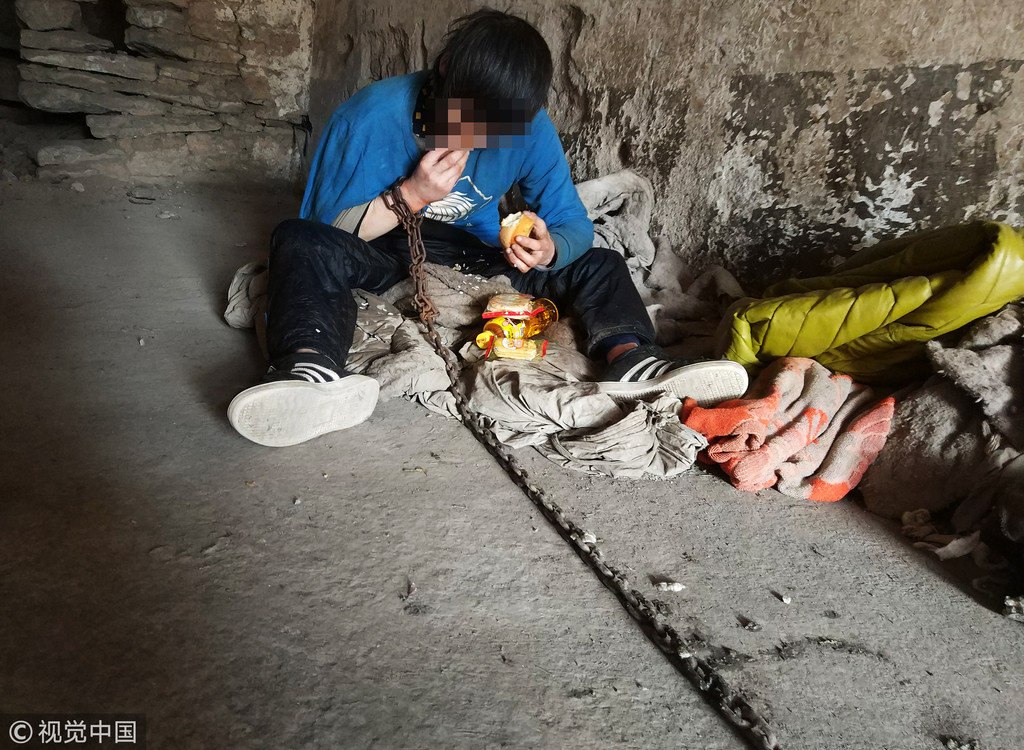 ▲因為老母親無力照顧,只能將聾啞兒子用鐵鍊鎖在石窟內。(圖/CFP/下同)