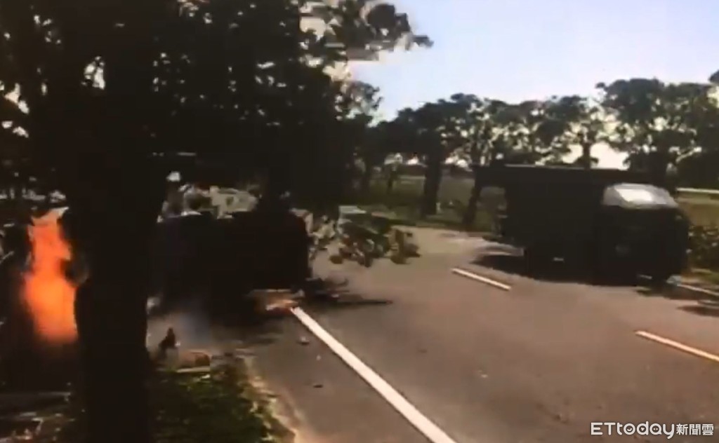 根據附近監視器畫面顯示,當時陳男開車行駛在165線道,前方分別是一輛紅色廂型車、3.5噸貨車,下一秒貨車先跨越車道試圖超過廂型車,這時他卻突然加速準備從2車中間穿越,最後被2車擠在中間、左右擦撞失控,車子直接衝向路旁撞斷一棵路樹,整輛轎車側翻瞬間起火燃燒。