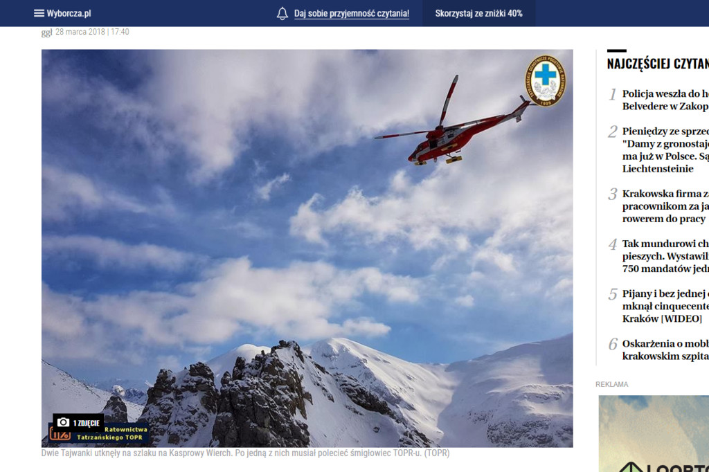 塔特拉山(Tatra)被稱為波蘭的冬季首都,每年都會吸引許多遊客前往觀光。近日卻傳出,有2名的台灣女登山客被發現凍壞在卡斯普羅維峰(Kasprowy Wierch)800米處,穿著單薄,搜救隊趕到時,看到她們腳上僅穿運動鞋,已經無法行走,因此出動直升機,將2人運下山送醫。
