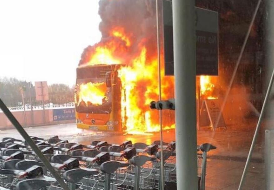 從照片中可見,整台巴士變成一團火球,火勢撲滅後車體只剩骨架,空氣也被濃煙染成深灰色,旅客在候機室都能看見大片煙霧。史坦斯特機場表示,起火原因是巴士的引擎故障,沒有人在事故中受傷。