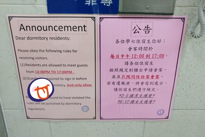 網友表示,公告的單位「學七舍」是師大公館校區的宿舍,上面提到每日中午12:00到17:00是會客時間「請各位住宿生按照規定到櫃台申請會客,並且只限同性訪客會客,若有違規者將會受到處分」。由於師大校內有許多外籍學生,宿舍還貼心放了英文版,但是卻變成了「And only allow homosexual」,可能是覺得這句話很重要,還用了紅色字加粗體及底線,根本無法忽略。