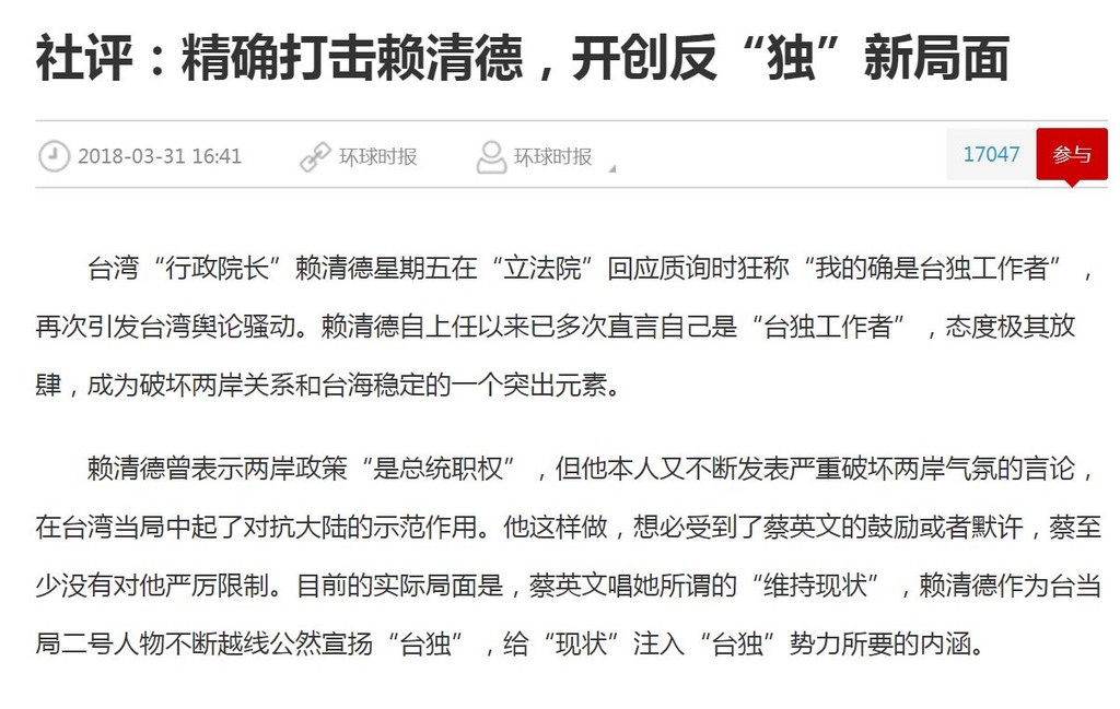 行政院長賴清德30日在立法院回應質詢時,狂稱「我的確是台獨工作者」。大陸官媒《環球時報》社評認為,賴清德自上任以來已多次直言自己是「台獨工作者」,已成為破壞兩岸關係和台海穩定的一個突出元素。大陸應該把賴清德列為第一個實施全面打擊的台獨政治人物,並建立起全面制裁、懲戒台獨政治人物的機制。並指「賴的大嘴不能簡單看成他個人的問題,這是台當局以『切香腸』方式踩踏紅線的嘗試之一」。