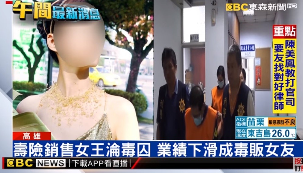高雄一名37歲的林姓女子在保險公司上班,過去業績超好,團隊業績更曾破億,不過後來染上毒品,除了業績下滑外,又要支應毒品開銷入不敷出,自願和大她20歲的楊姓男子交往同居,還幫忙販毒,警方上門逮人時,楊姓男子還在睡夢中就被抓,屋內海報還貼著一張她「高雄縣銷售王」的海報,不過容貌和現在差別非常大。