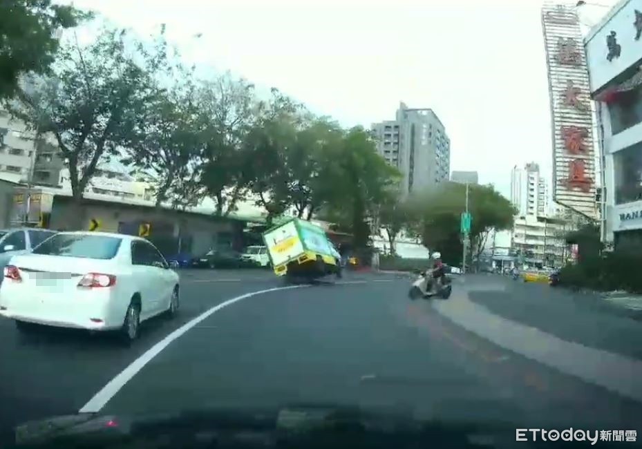 影片中可以看見,當時貨車行經覺民路時,因為前方有一輛轎車速度緩慢,貨車司機就準備從右側加速超車,但是因為車子載貨後重心比較高,轉彎的離心力竟然讓右車輪懸空、差點左翻,嚇得司機立刻要回正,但此時車子已經完全失控,換左側兩輪懸空、最後直接撞向路邊行道樹。