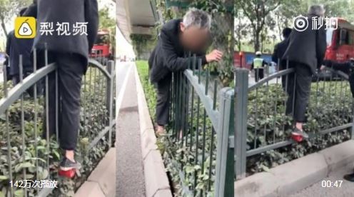 根據大陸《梨視頻》報導,穿著黑衣、黑褲的白髮阿伯上半身趴伏在鐵欄杆上,痛苦地頻頻催問路人「(消防隊)還要多久(才來)」;一旁幫忙報案的男子和民警先是安慰他「不要著急,馬上就來」,路過的駕駛還將車上的滅火器拿來給阿伯墊腳,好讓他懸空的腳有施力點可以踩著。