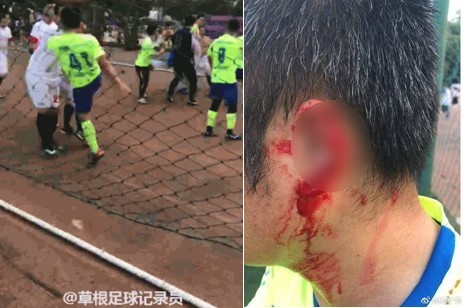據《澎湃新聞》報導,網友2日爆料,南寧廣西大學31日下午舉辦「老野杯」業餘足球賽,就在粵桂球會對陣馬路隊時,雙方球員爆發衝突,馬路隊27號球員竟將粵桂球會41號球員的左耳咬下一塊,還附上一張血跡斑斑的受傷照片。