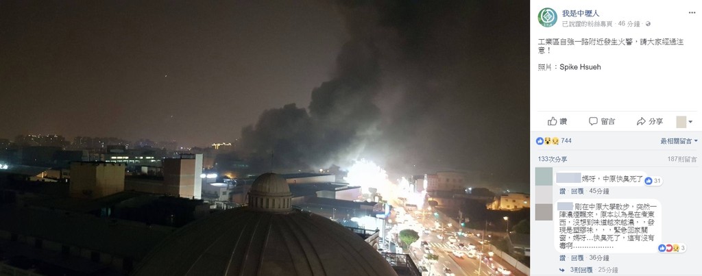 中原夜市好臭!臉書粉絲專頁「我是中壢人」2日晚間7時33分PO出照片,表示位於工業區自強一路附近發生嚴重火警,濃烈黑煙不斷竄出,連帶影響鄰近的中原大學、中原夜市都一片灰濛濛,目前當地空氣品質指標值(AQI)更已達到153的「中度污染」等級,不少網友紛紛留言「真的超臭,臭到無法正常呼吸,濃濃的燒塑膠味!」