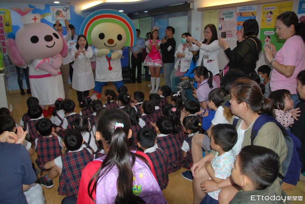 台南市郭綜合醫院慶祝兒童節,與7-11超商合作,配合手部衛生宣導,讓前來參加的YMCA幼稚園的幼童和看病的小朋友們,與小桃、OPEN將吉祥大玩偶玩的很高興,同時學到如何正確洗手觀念,個個興奮不已。