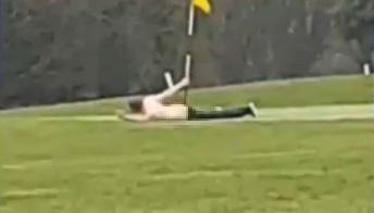 從視頻可以看到,男子當天直接走向第九號高爾夫球洞,脫掉身上衣物後就開始做出猥褻動作,並露著屁股,一直搖著手中6英呎長的旗桿,另一手則拿著手機自拍。大約1分鐘後,男子才把旗桿放進洞裡,從地上爬起穿好脫一半的褲子。