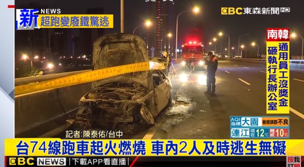 台中市台74線西屯段北上10.7公里處,7日凌晨4點多發生一起BMW雙門跑車突然自燃,警消抵達現場時,車子已經燒成廢鐵,不過車內車外都沒有看到人,警消事後在附近找到葉姓駕駛,葉姓駕駛表示,「車是和朋友借的,引擎蓋突然冒煙燃燒。」起火原因還要再進一步釐清。