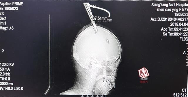 醫生檢查發現,剪刀刀尖斜嵌在沈女的顱骨裡,離腦髓只有2、3公厘,幸好是斜著插進去,如果垂直刺入,很有可能造成癱瘓,經過手術後順利將剪刀取出,目前生命已無危險,但仍在加護病房進一步觀察。