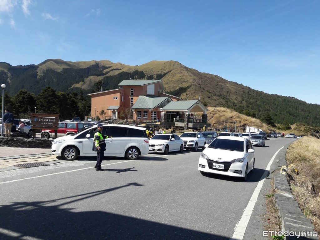 林福長說,8日10時至16時為交通巔峰,自台14甲線31.5公里武嶺停車場開始往東,沿途的水晶宮陡坡、合歡山莊停車場、石門山登山口、小風口管理站,直至台14甲線37.2公里的合歡北峰登山口,這5.7公里之間各停車場均塞滿了車輛,停車位無法容納絡繹不絕的車潮,遊客只好將車輛停在道路兩側。