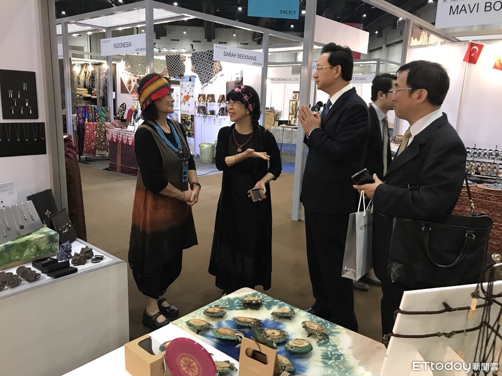 ▲東華品牌DART Taiwan獲邀參加2018曼谷國際創新工藝展,駐泰國台北經濟文化辦事處童振源代表率同仁蒞臨會場表達讚許及鼓勵。{圖/東華大學提供 下同)
