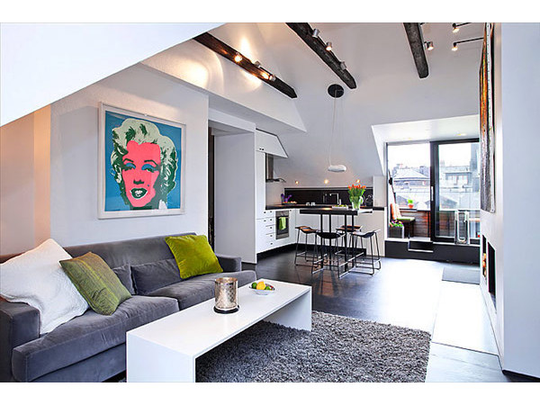 這間公寓可能不能算小,甚至可以稱作豪宅了,除了那懷舊的暖爐,還有專屬的陽台以及吧檯。另外不規則的室內空間更增添了視覺上的寬敞感!