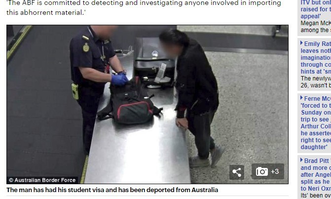 據澳洲媒體報導,男學生自廣州搭乘班機前往澳洲墨爾本,9日抵達墨爾本機場時,被選中檢查行李與手機,海關人員從他所持有的2部手機中,赫然發現存有多部兒童色情影片。事後,該名陸生被取消學生簽證,並且帶往拘留所等候驅逐出境。
