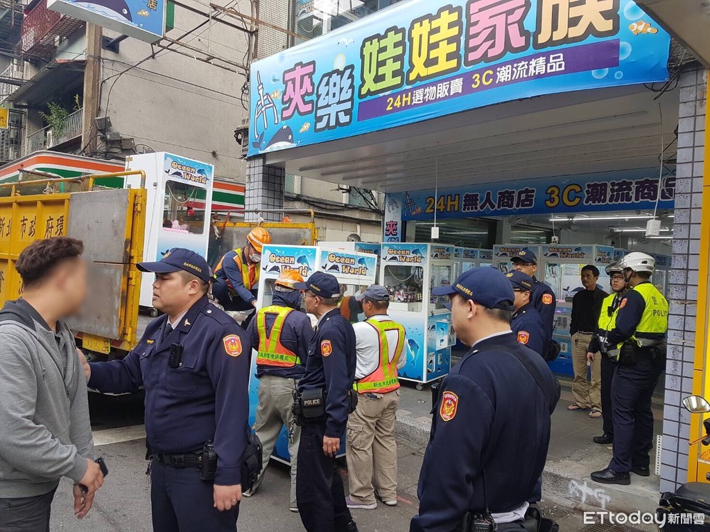 警方表示,該娃娃機店屢遭投訴檢舉,轄區光明派出所員警日前前往理解,發現店家之娃娃機占用騎樓,於是先張貼公告請店家改善,仍是擺放多台娃娃機台於騎樓下,甚至在底板上鎖上鐵架,影響道路使用人的權力甚鉅。