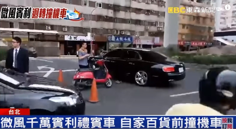 台北市市民大道4段13日中午發生一起車禍,一輛機車為閃避前方左轉車輛,不慎撞上準備駛入迴轉道的賓利禮車;這輛黑色的賓利來頭不小,是微風百貨專門載送客人的公務車,新車要價新台幣1380萬,此次被機車騎士這麼一撞,光是車門刮傷的維修費用,粗估就要20萬元起跳,讓騎士當場傻愣原地,擔心後續付不出賠償費用。但微風百貨表示,騎士的傷勢要緊,後續將不會向其索賠維修費用。