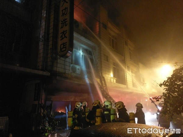 ▲桃園市中壢區一棟三樓民宅凌晨發生大火,消防人員以水柱灌救。(圖/桃園市消防局提供)