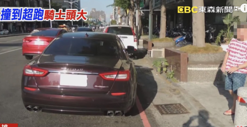 根據監視器畫面,一部汽車從五福路左轉成功路時,跟一部機車發生碰撞,機車飛出去時,正巧一台路過的瑪莎拉蒂被機車擦到,只見車主將愛車瑪莎拉蒂停在路邊,穿著短褲的他,無奈地手拿證件,心疼車門及輪胎上方的車體一道道刮痕。