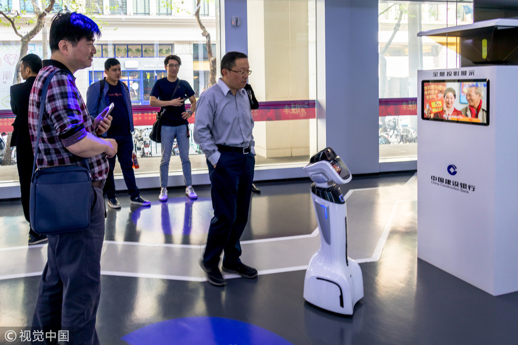 ▲大陸首家「無人銀行」,機器人在門口迎賓。(圖/CFP)