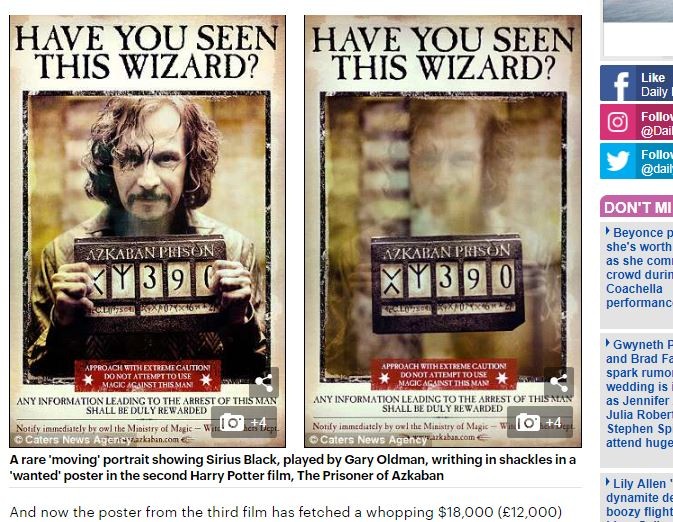 《哈利波特》的魔法世界風靡全球,電影第3集《哈利波特:阿茲卡班的逃犯》(Harry Potter and the Prisoner of Azkaban)中曾出現的一張會動的海報,上頭印有飾演天狼星(Sirius Black)的英國男星蓋瑞.歐德曼(Gary Oldman)。這張海報近日在美國德州拍賣,以1.8萬美元(約新台幣52.7萬元)的高價成交,高出底價6倍,創下了此電影系列海報中最高價成交的紀錄。