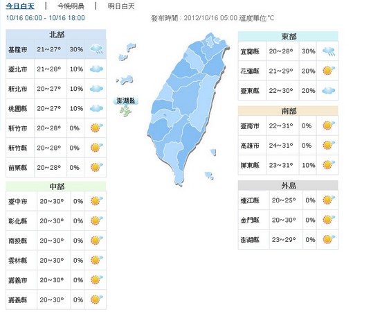 台灣各地16日為多雲到晴的天氣,僅東北部地區及北部山區有局部短暫雨,南部山區午後亦有局部短暫陣雨。17日東北季風增強,北部及東北部地區氣溫稍降;東半部及北部地區有局部短暫雨,南部山區午後亦有局部短暫陣雨,其他地區為多雲到晴的天氣。