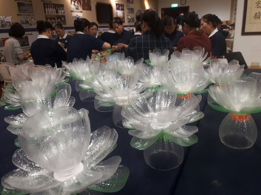 一個個回收來的寶特瓶,經洗淨、巧藝製作,化為浴佛環保燈湯座與環保花,這是對蘊育萬物的地球,最虔敬的回饋。2018年慈濟基金會將在臺北中正紀念堂舉辦的浴佛大典,慈濟志工用寶特瓶製作逾兩千組的環保蓮花、獻供電子燈座及獻供湯座,將於5月13日佛誕節、母親節照亮中正紀念堂。