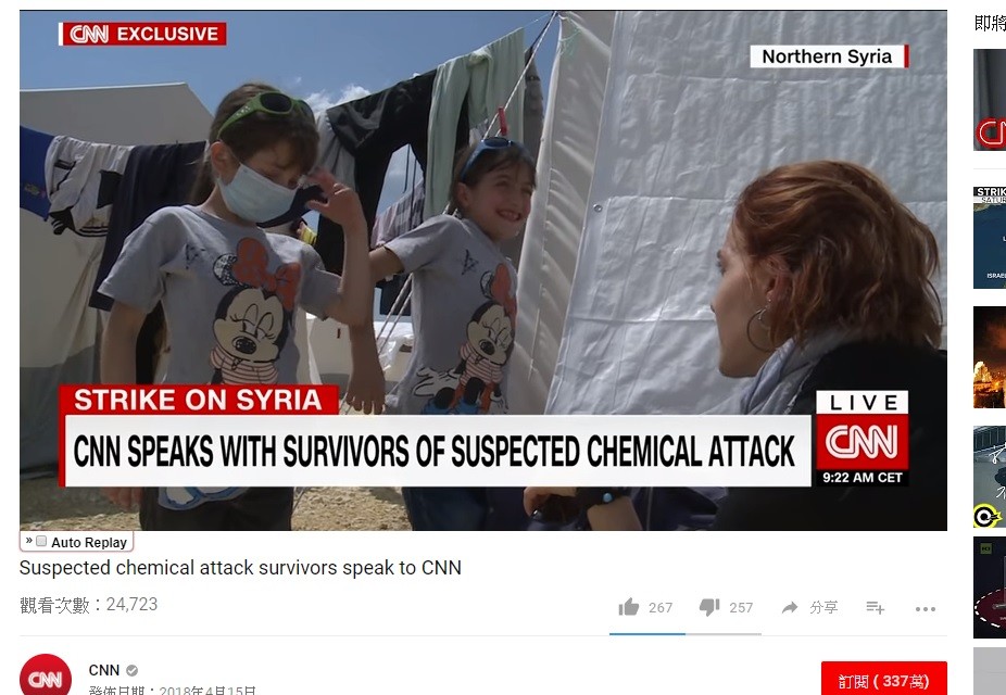 敘利亞首都大馬士革的杜馬鎮(Douma)於7日遭化武攻擊,人民緊急撤離該地區,跑到附近的難民營避難。原本住在杜馬的婦女回憶道,發生化學武器攻擊的當下,她身體突然變得軟弱無力,像所有力量都被吸走了一樣。提到未來志願,一對倖存的雙胞胎孩童表示,他們都想成為醫生,只為解救受傷的人。