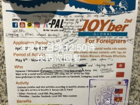 一名在南韓的大陸留學生日前眼尖發現,濟州航空在召募海報上,指名要來自「日本、越南、台灣、中國、香港」的留學生,他向濟洲航空提出抗議,揚言要撕下海報,主辦單位隨即回覆,若是撕掉海報,將被提交校方懲戒,最後則是將「中國」改為「山東」。