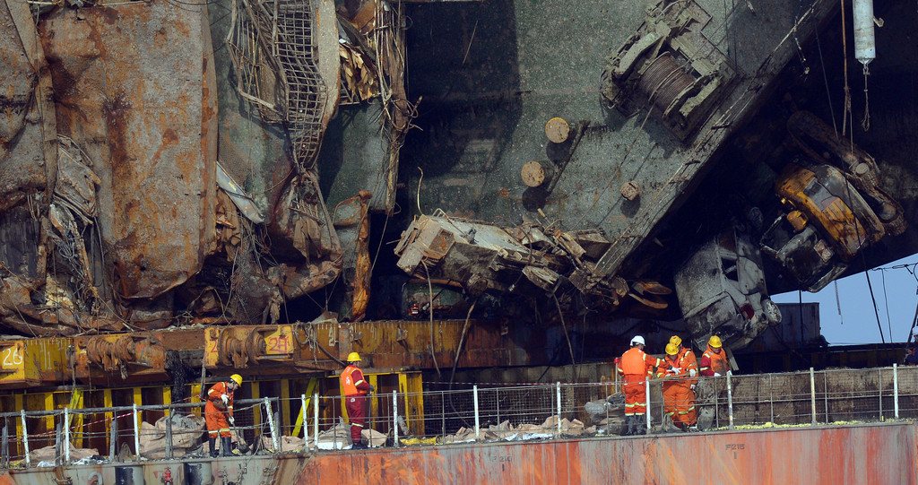 ▲「世越號」沉沒3年後,於2017年03月被打撈並運到木浦新港。(圖/路透社,下同)