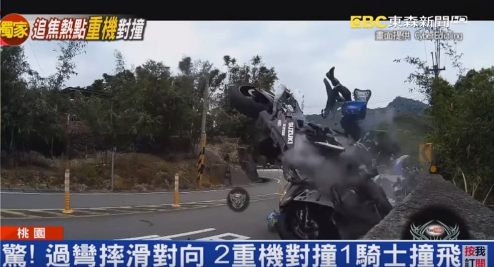 桃園大溪區省道台七乙9K處本月1日發生一起重機車禍,翁姓騎士騎著要價破百萬的重機BMW S1000RR馳騁在山道上,不料過彎壓車時卻打滑自摔,連人帶車滑向對向車道;當時林姓騎士騎著重機Suzuki GSX-R1000閃避不及,直接撞上翁男重機,整個人向前彈飛,倒臥在地神情相當痛苦。警方表示,事後將2人送醫後,林男手腕骨折,2人皆無生命危險。