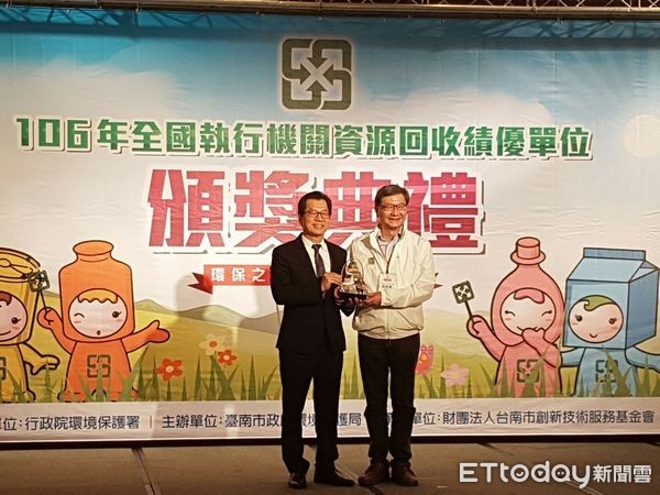 環保局長沈志修16日前往臺南,出席 106年全國資源回收考核頒獎典禮受獎。環保局指出,桃園的資源回收率從升格前(103年)的43.03%,一路進步到106年的54.85%,整整成長逾11個百分點。若和105年相比,106年的回收量增加約11萬公噸,資收率也進步了7個百分點,績效有目共睹。