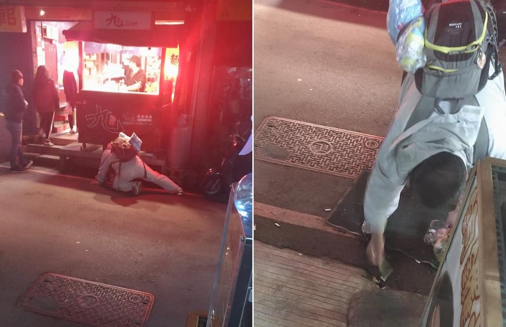 ▲背包男單腳跪在地上撿菸蒂。(圖/翻攝自爆料公社,下同)