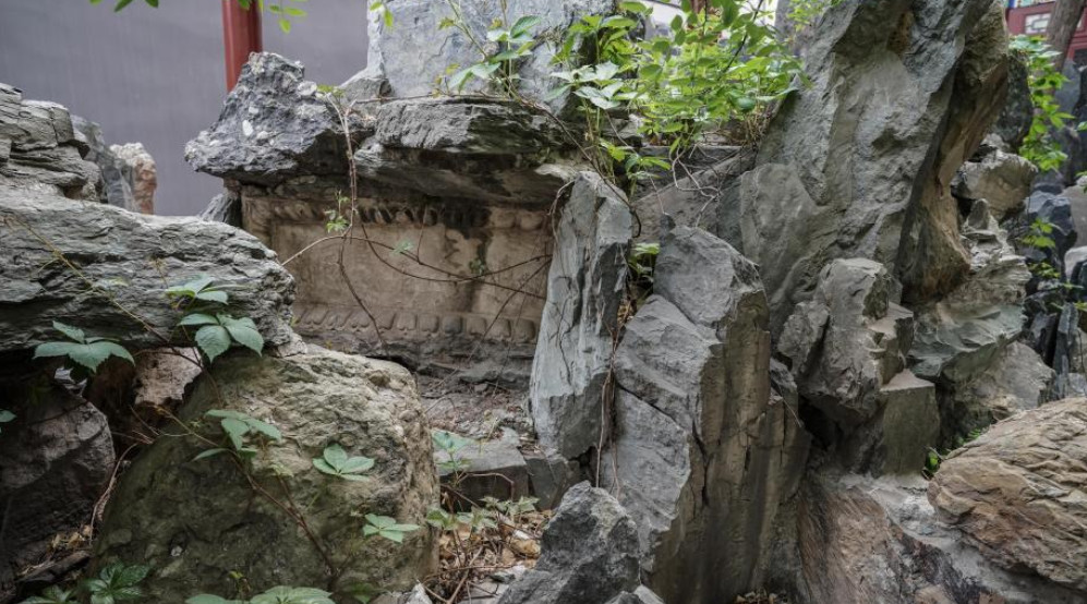 從照片中可以看到,兩件文物位於中式庭院裡亭子邊的假山石塊下,周邊種滿了花草,若不仔細尋找很難發現。乾隆御筆「熙春洞」石匾額只能清晰地看到「洞」字,另外兩字很難辨清,而嘉慶禦筆「稱松岩」已不完整,中間出現了兩三條裂縫。