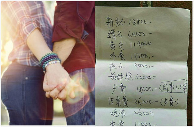 女網友先是在「爆料公社」po文說,好友跟男友訂婚2個月,眼看結婚日子將至,女生發現再也忍受不下去,於是希望婚禮可以延期,結果男方竟不打算挽留,直說「那就不要在一起啊」,接著開出一張明細,「好友拿給我看,我傻眼,沒看過這麼小氣的男生。」