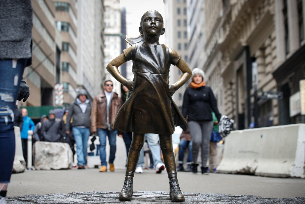 ▲美國紐約市華爾街的無畏女孩(Fearless Girl)銅像。(圖/路透)