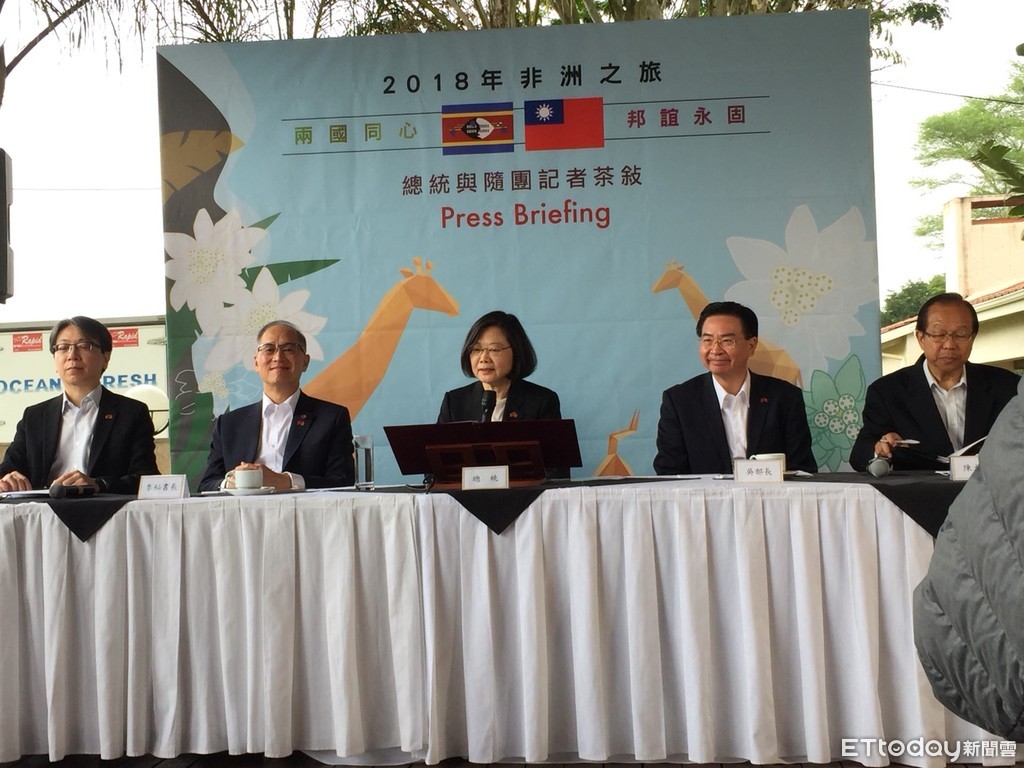 ▲總統蔡英文在史瓦濟蘭與隨行媒體茶敘。(圖/記者陶本和攝,下同)