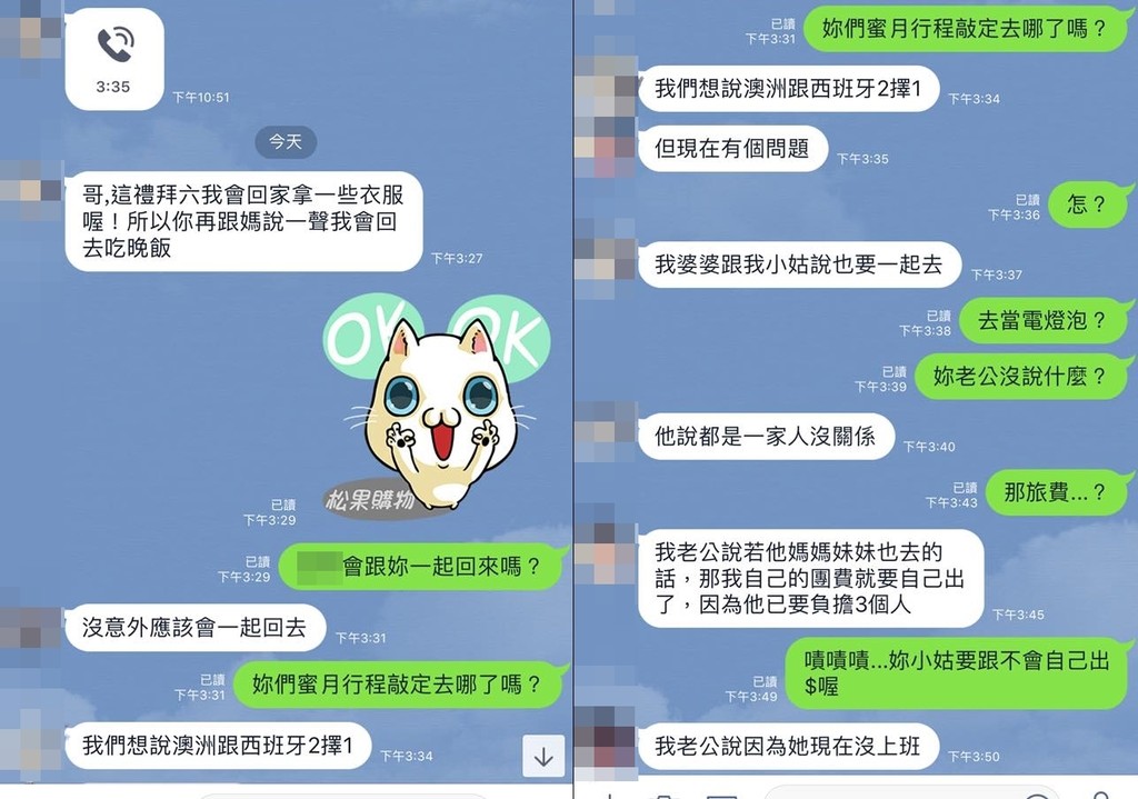 ▲婆婆和小姑要跟著去浪漫的蜜月旅行,是一大難解習題。(圖/翻攝爆怨公社)