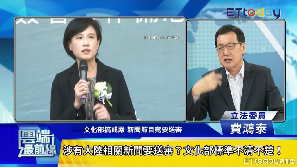 ETtoday新聞雲《慧眼看天下》21日晚上9點首播,竟在播出前接到文化部致電「關切」,原因是對於這個節目的其中一句slogan有疑慮,因此「善意」提醒若節目中有陸節目片段,就必須送文化部審查。國民黨立委費鴻泰今天(23日)在《雲端最前線》表示,台灣現在很多新聞節目都會使用大陸圖片或片段,難道這些節目都必須送審?他說:「過去民進黨在野時一直在爭取言論自由,難道執政後就要箝制言論自由嗎?」