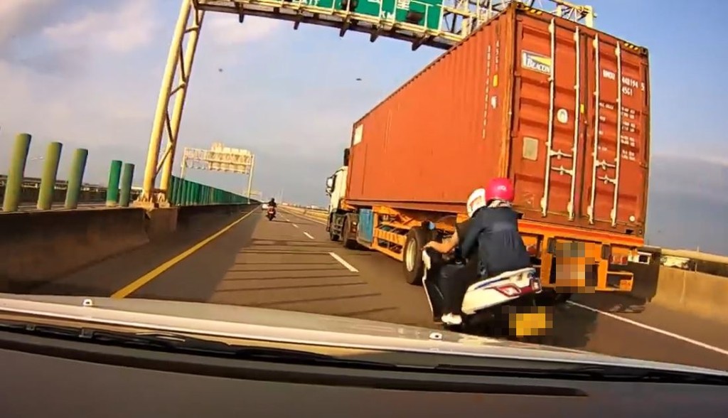 社會新聞上經常可以看見,機車騎在大型車輛旁邊,因為打滑、地面不平等諸多原因摔車,結果被大車捲入輾死的不幸意外。但是在臉書社團「爆料公社」有網友分享一支影片,內容是一輛雙載的黃牌重機超車時,竟然貼的離貨櫃車極度靠近,看得他不禁搖頭嘆說:「一定要這樣鑽嗎?」