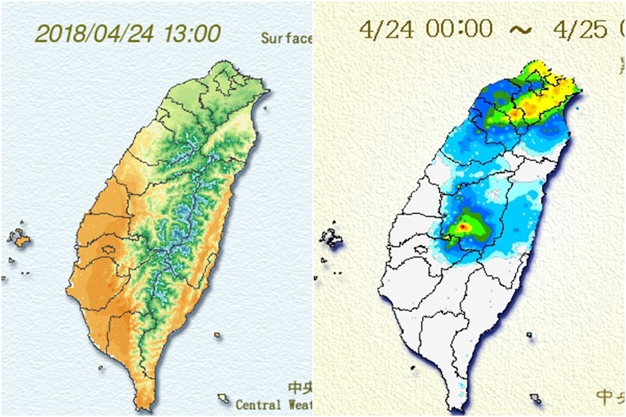 氣象局表示,24日鋒面抵達台灣,為北部、中南部帶來明顯雨勢,入夜後趨緩,解除豪雨特報,隨著鋒面遠離,25日白天中部以北降雨逐漸停歇,但南部及東半部仍偶有小雨,中南部山區午後仍然可能有短暫大陣雨出現;此外東北風帶來些許涼空氣,清晨中部以北及東半部將只剩下18至21度,南部則約24度,降低3度左右,白天呈現北東偏涼、高溫約22至24度,中南暖熱30度的兩片天。