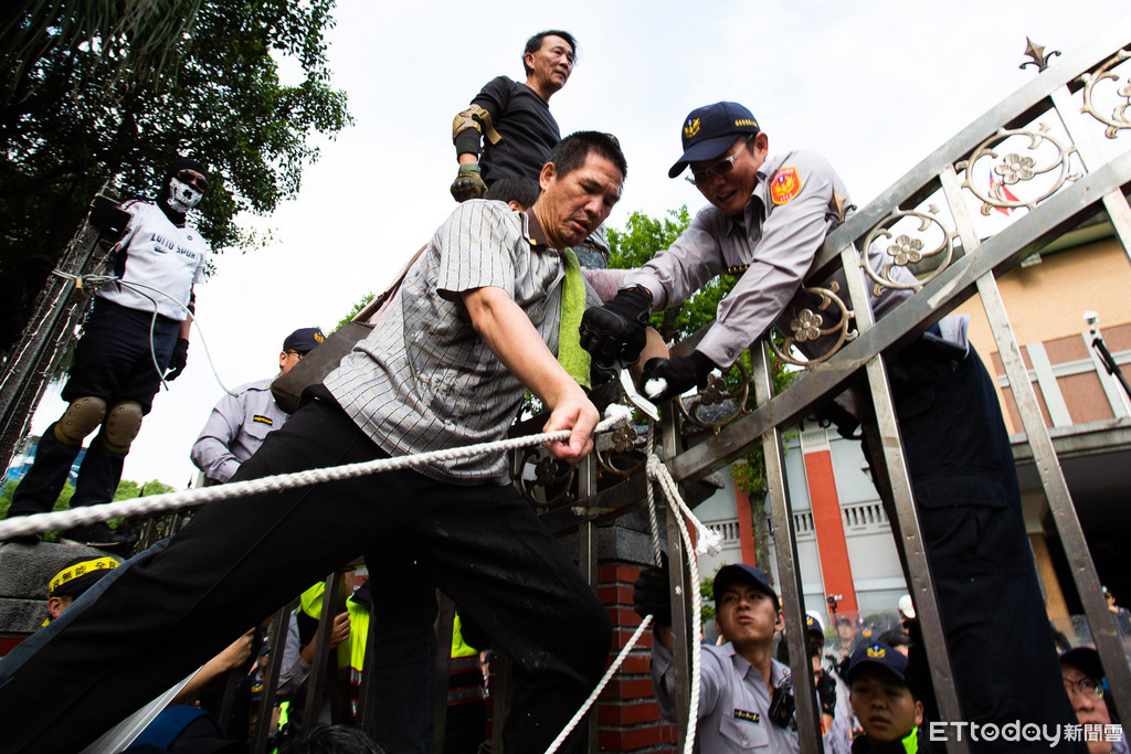 ▲「八百壯士」攜帶油壓剪與鐵鍊,試圖破壞拒馬攻入立法院。(圖/記者季相儒攝,下同)