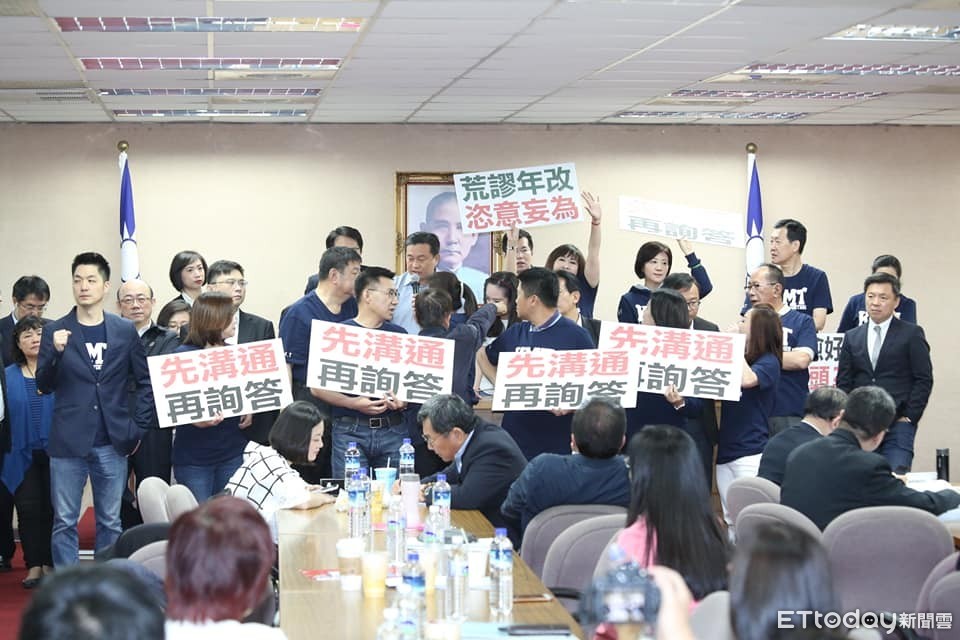 立法院外交及國防委員會26日排定進行攸關軍人年改草案的《陸海空軍軍官士官服役條例》修正草案初審詢答,而國民黨團、民進黨團一早就進入會議室分佔主席台、發言台,還一度爆發口角。待民進黨籍召委王定宇宣布開會,國民黨立委湧上前擋住主席台,並舉出標語高喊「先溝通、再詢答」,讓王定宇被迫宣布休息溝通。