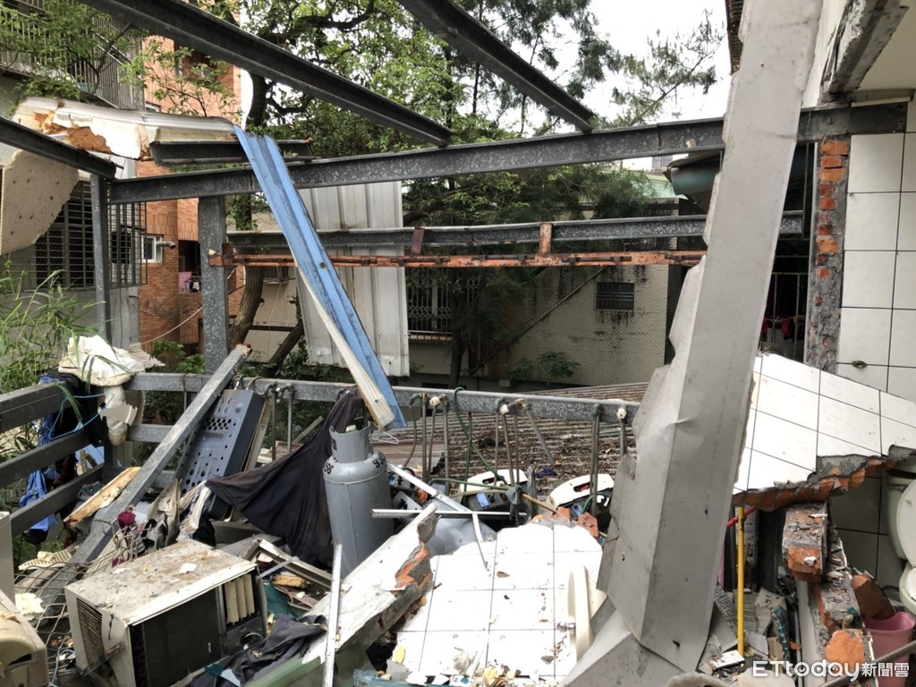 ▲爆炸威力相當強大,牆壁遭炸毀倒塌,瓦礫碎片四散,屋頂、窗戶也被炸翻,露出鋼架。(圖/記者莊智勝翻攝)